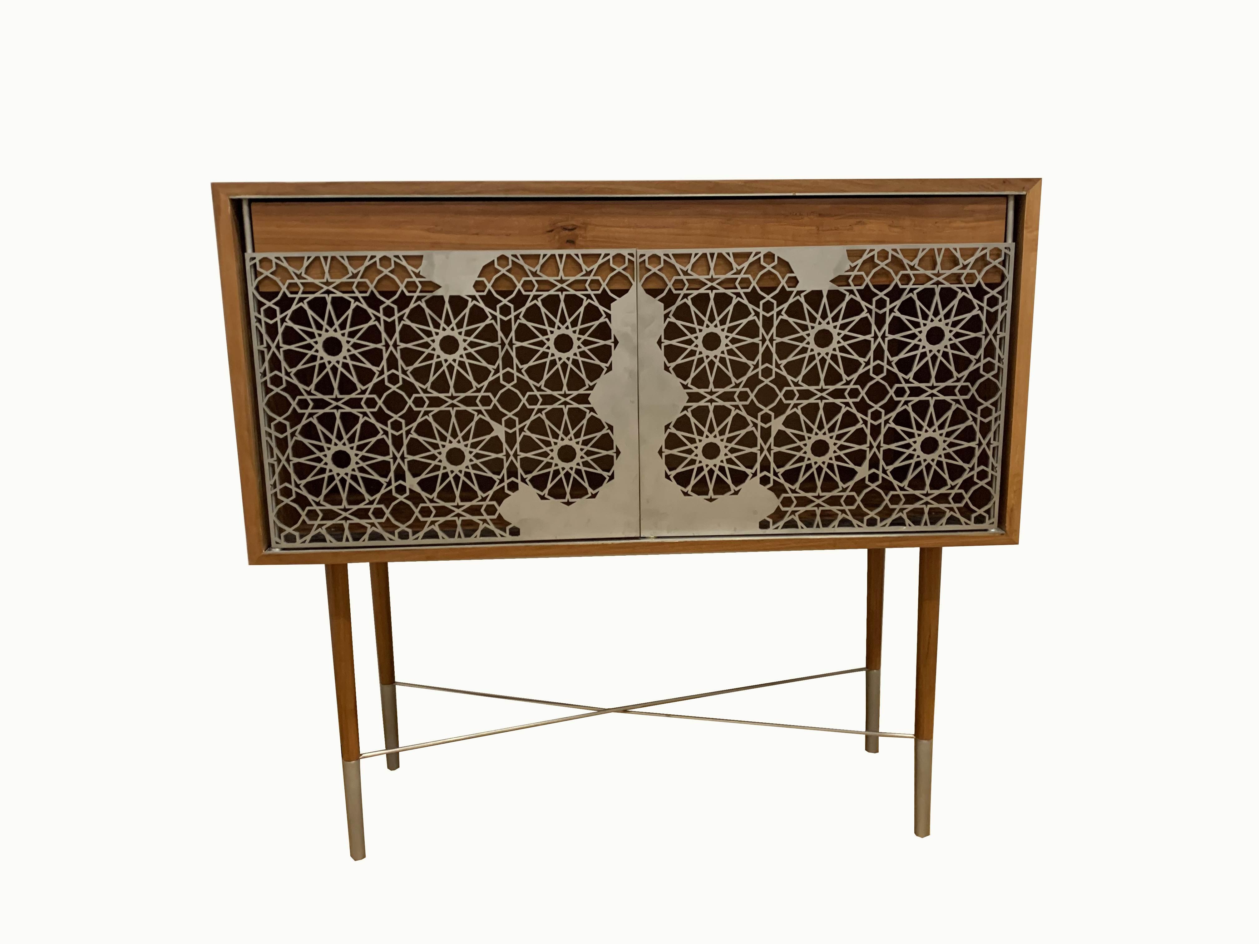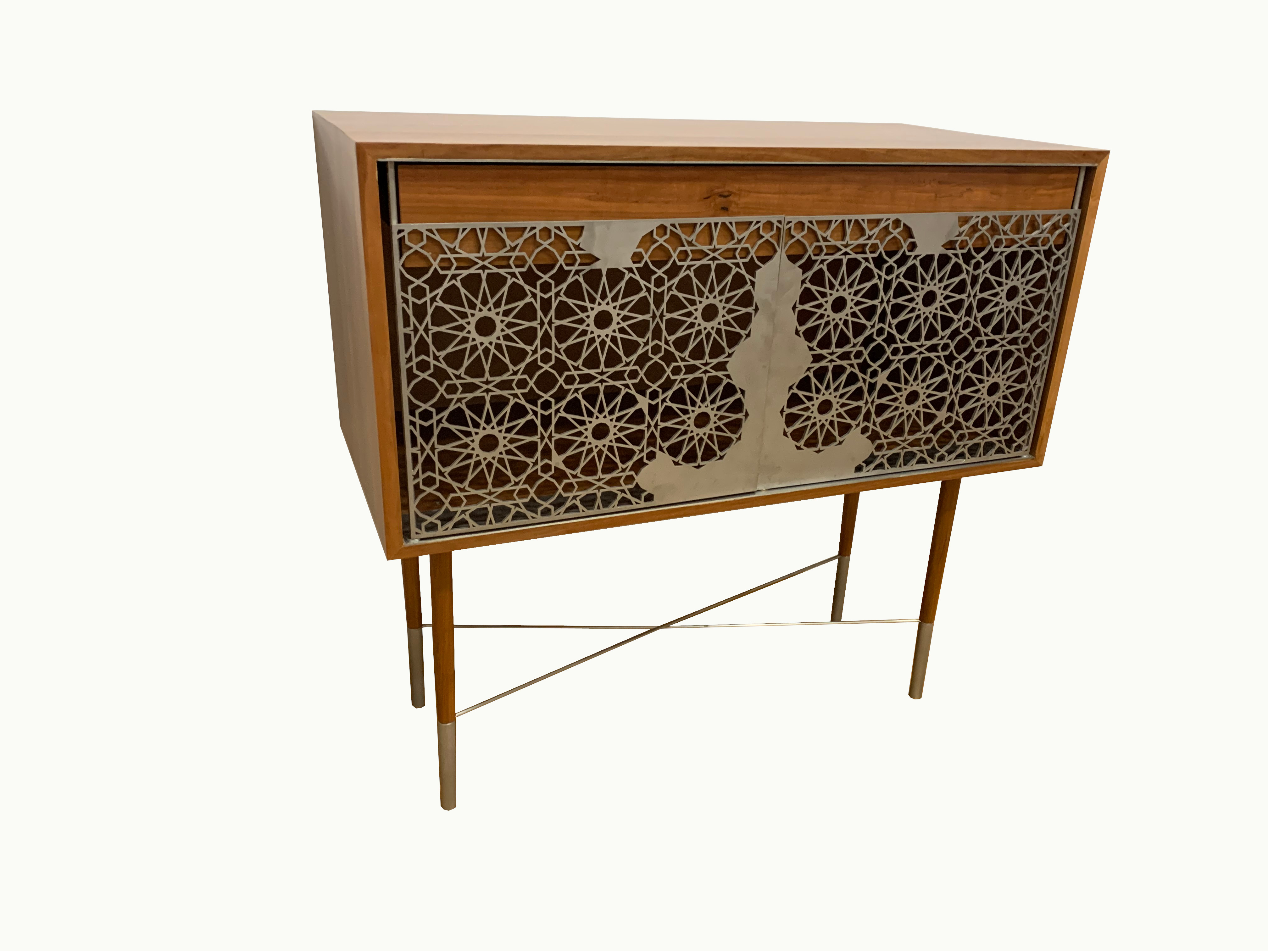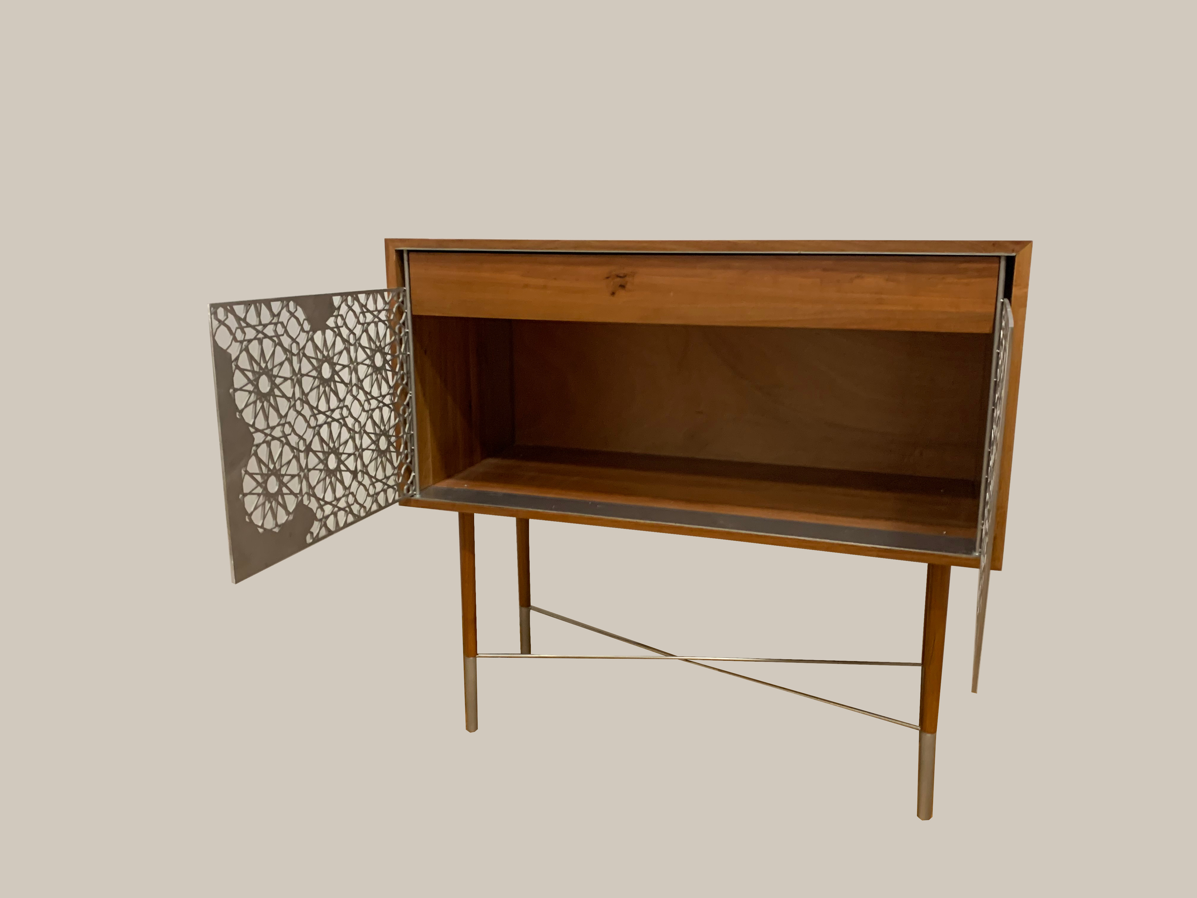 Inspirisana istokom, povezana sa severom. Svedeni dizajn koji pleni svojim izgledom. Uklapa se u gotovo sve stilove enterijera. Izrađena od drveta kruške sa vratima i detaljima od inoxa. Dimenzije komode su 95x45x90 cm ( širina, dubina, visina ).